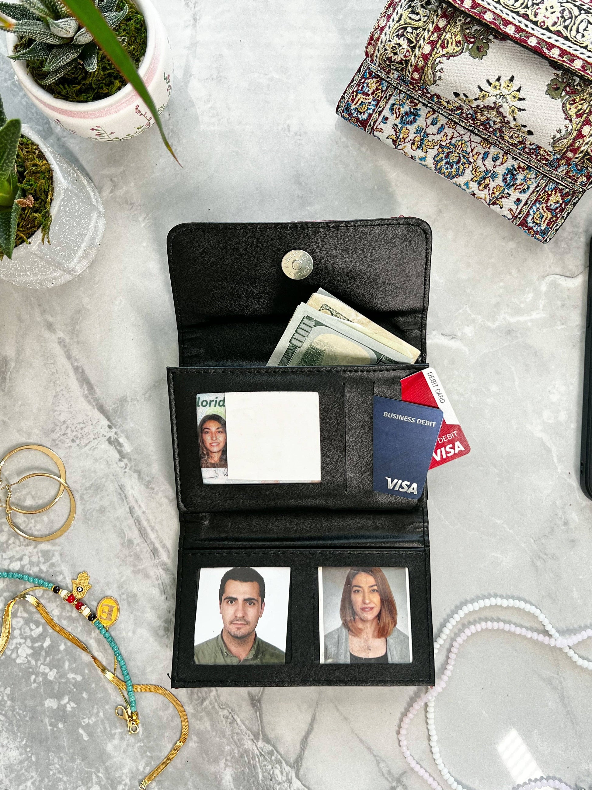 Our Boho wallet is crafted from vegan leather and brocade fabric inspired from Turkish carpet pattern. You will love the soft glimmering gold touch giving these handmade Turkish wallets a luxurious look. The design of the fabric is not a print, it's woven.
